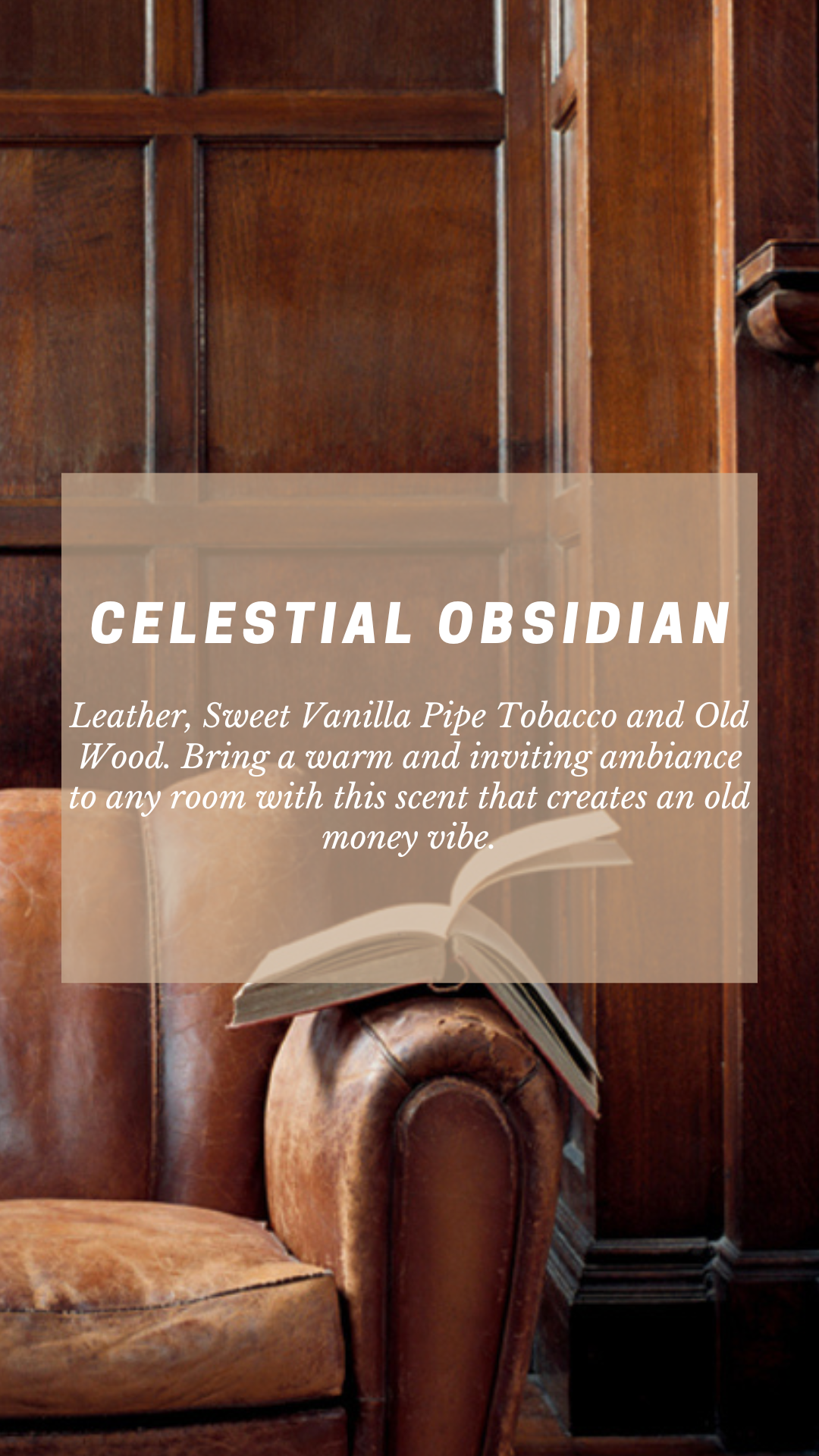 Leather, Sweet Vanilla Pipe Tobacco and Old Wood. Bring a warm and inviting ambiance to any room with this scent that creates an old money vibe.